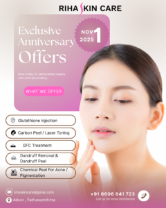 Riha Skin Care is a leading skin care hospital located in Adoor, Pathanamthitta. We live by our tagline, “Your Skin, Our Priority,” and are dedicated to providing exceptional care to help you achieve your healthiest and most radiant skin.